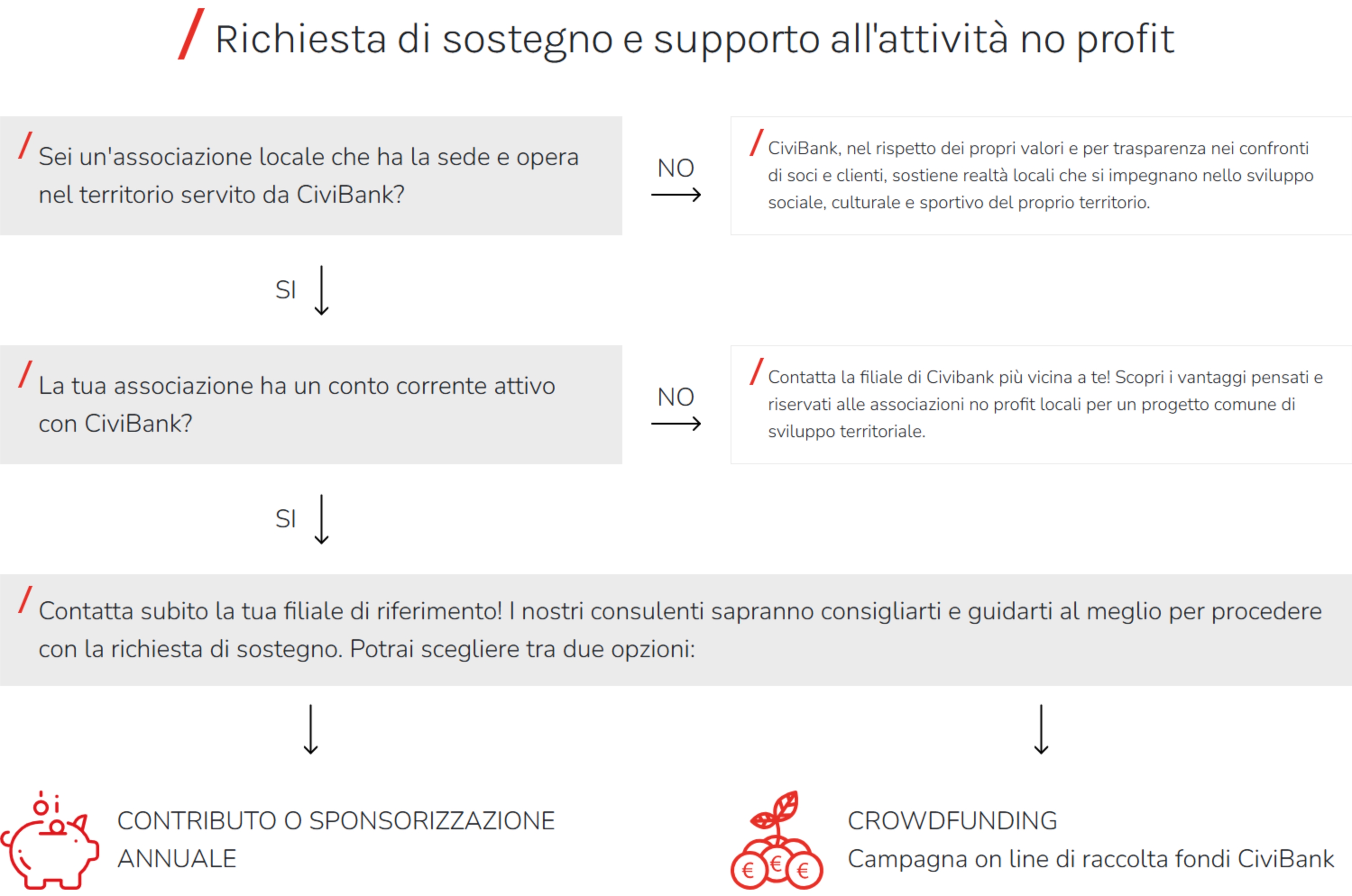 Oggi “Progetto CiviBanca” si declina in due modi di agire: sostegno alle associazioni no profit meritevoli presenti sul territorio e supporto alle realtà del terzo settore che decidono di attivare una raccolta fondi on line con lo strumento del crowdfunding (da crowd, «folla» e funding, «finanziamento»).