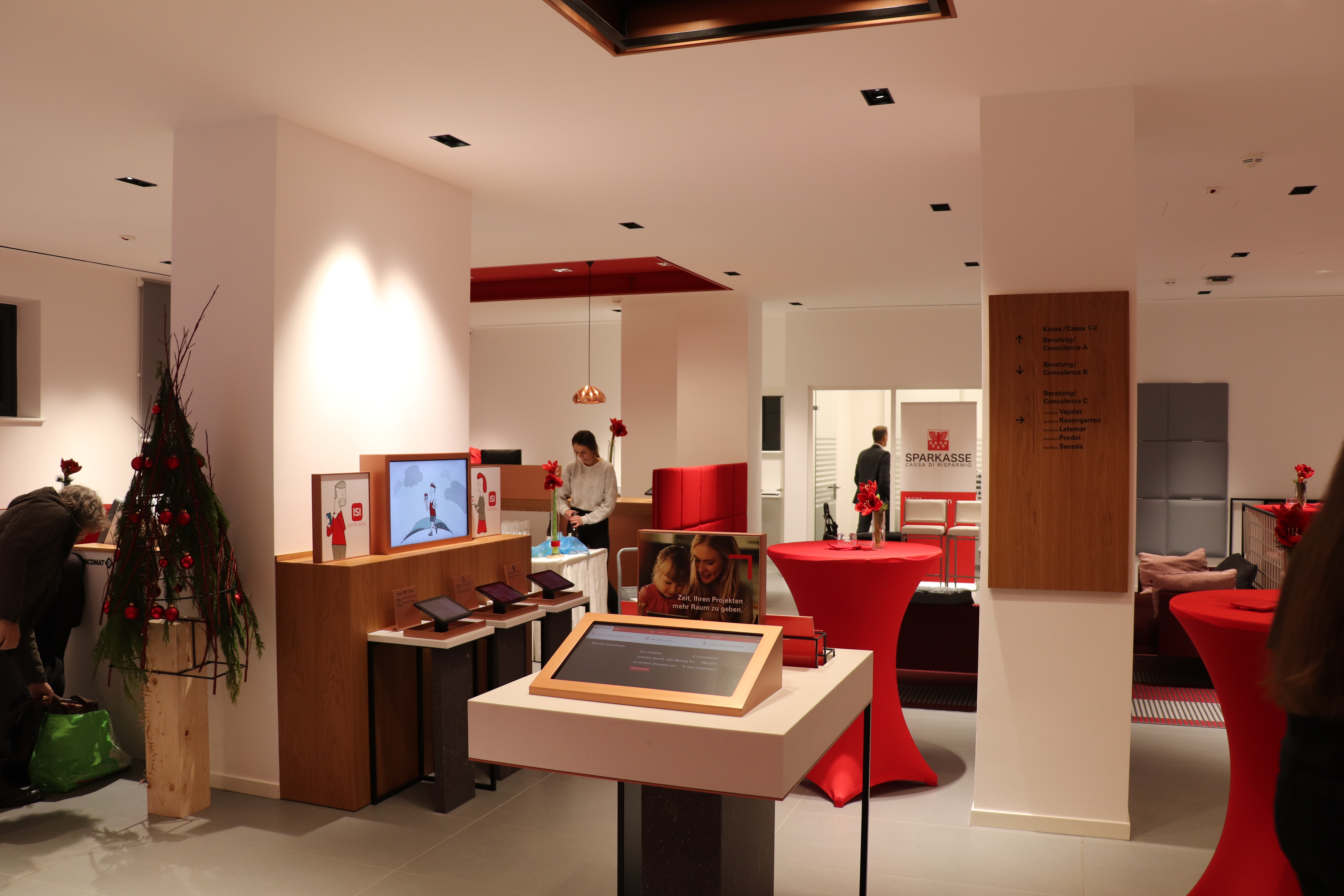 Das Filialkonzept, das die Sparkasse umgesetzt hat, zeichnet sich durch ein neues Raumverständnisaus aus, das eine umfassende und persönliche Beratung gewährleistet. Gleichzeitig können Servicedienste zunehmend selbstständig in Anspruch genommen werden. Großer Wert wird auch auf eine effiziente Produktkommunikation gelegt.