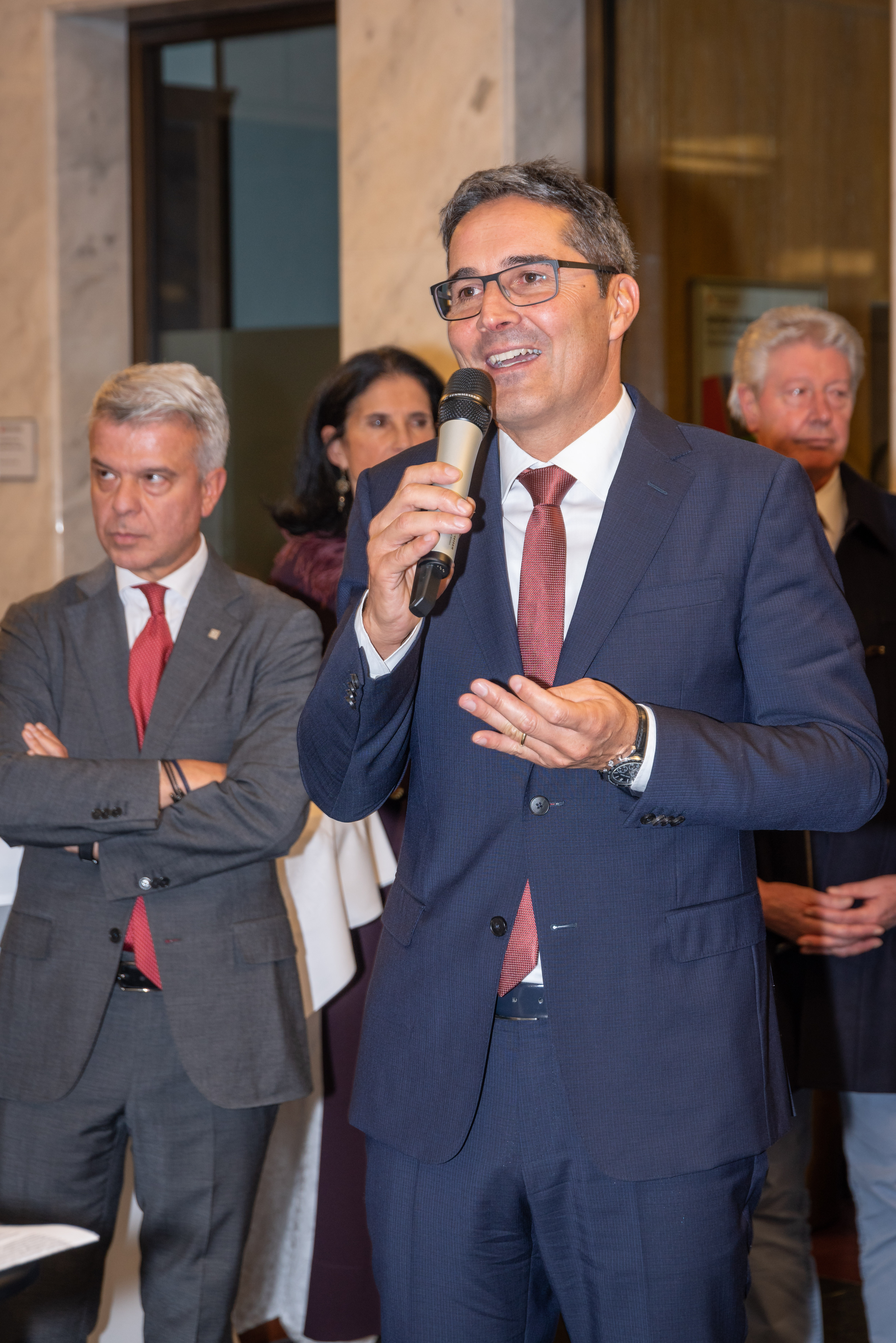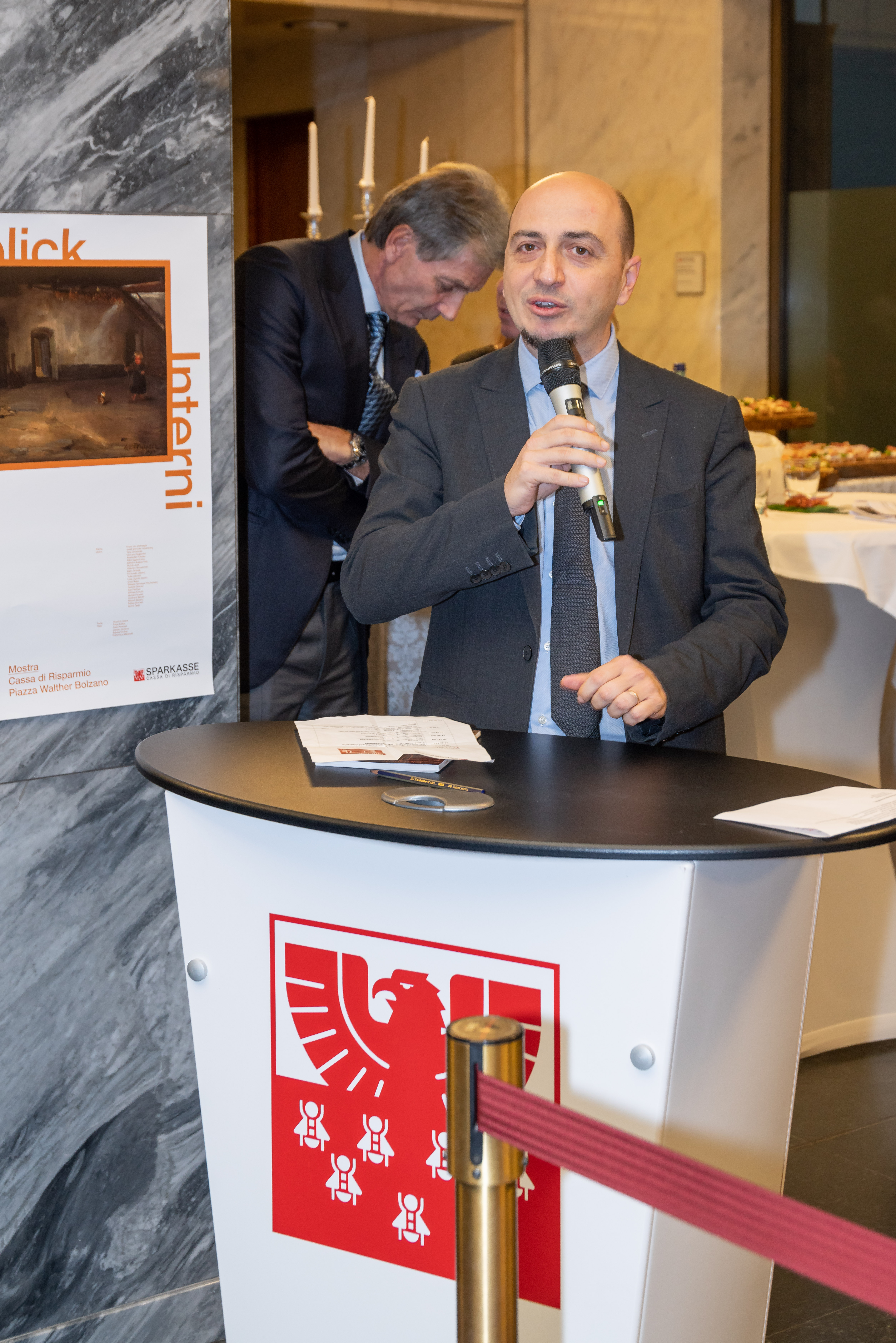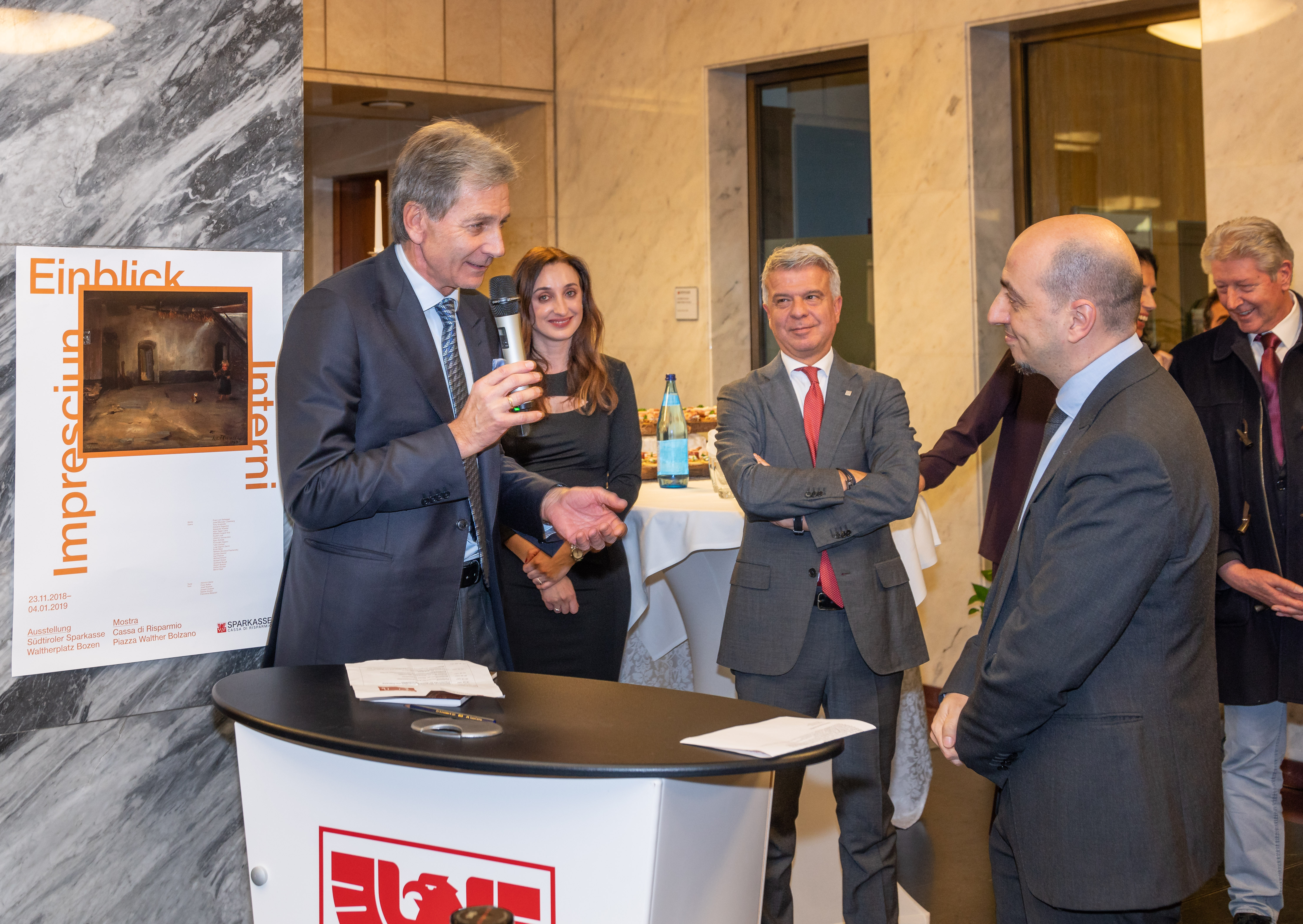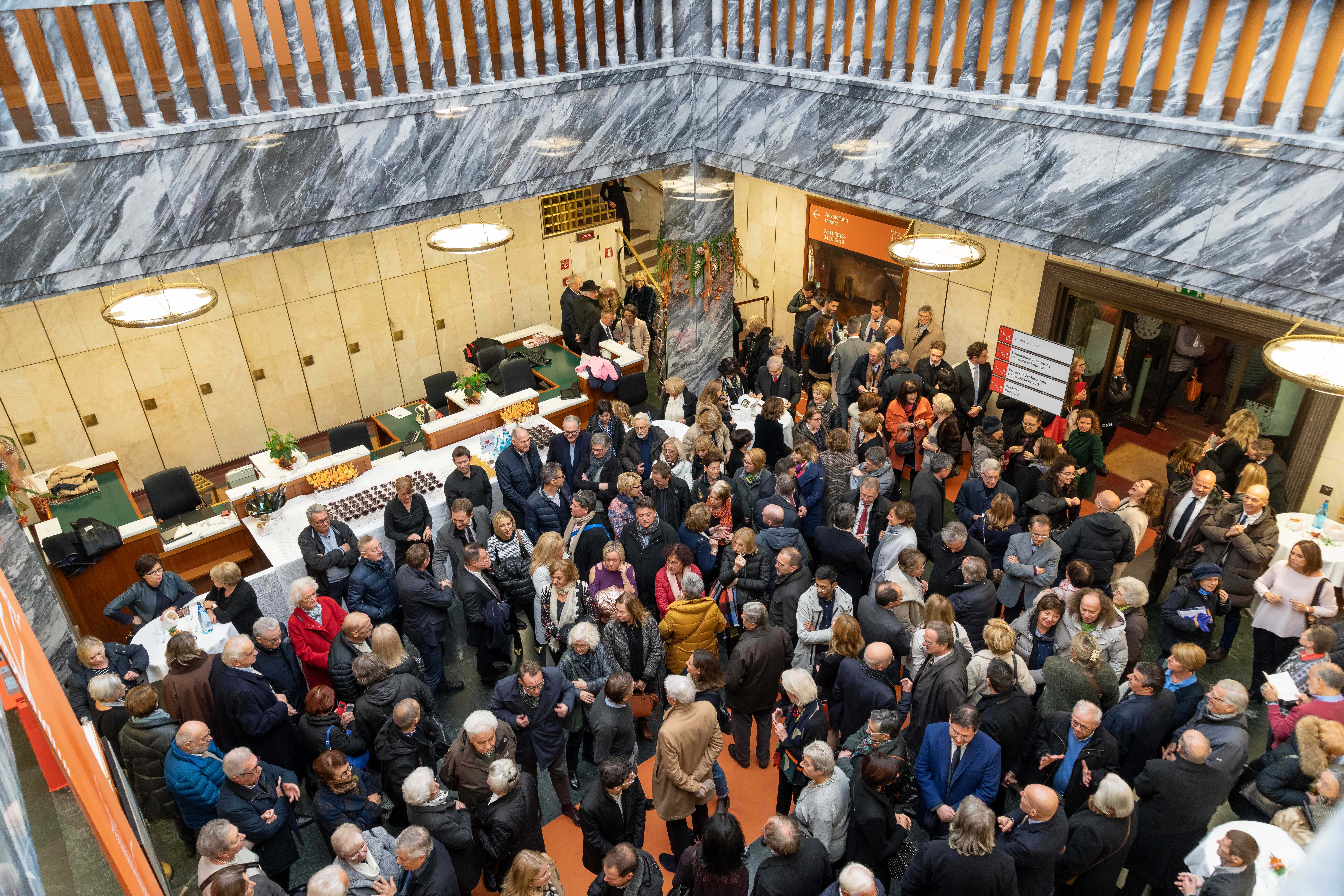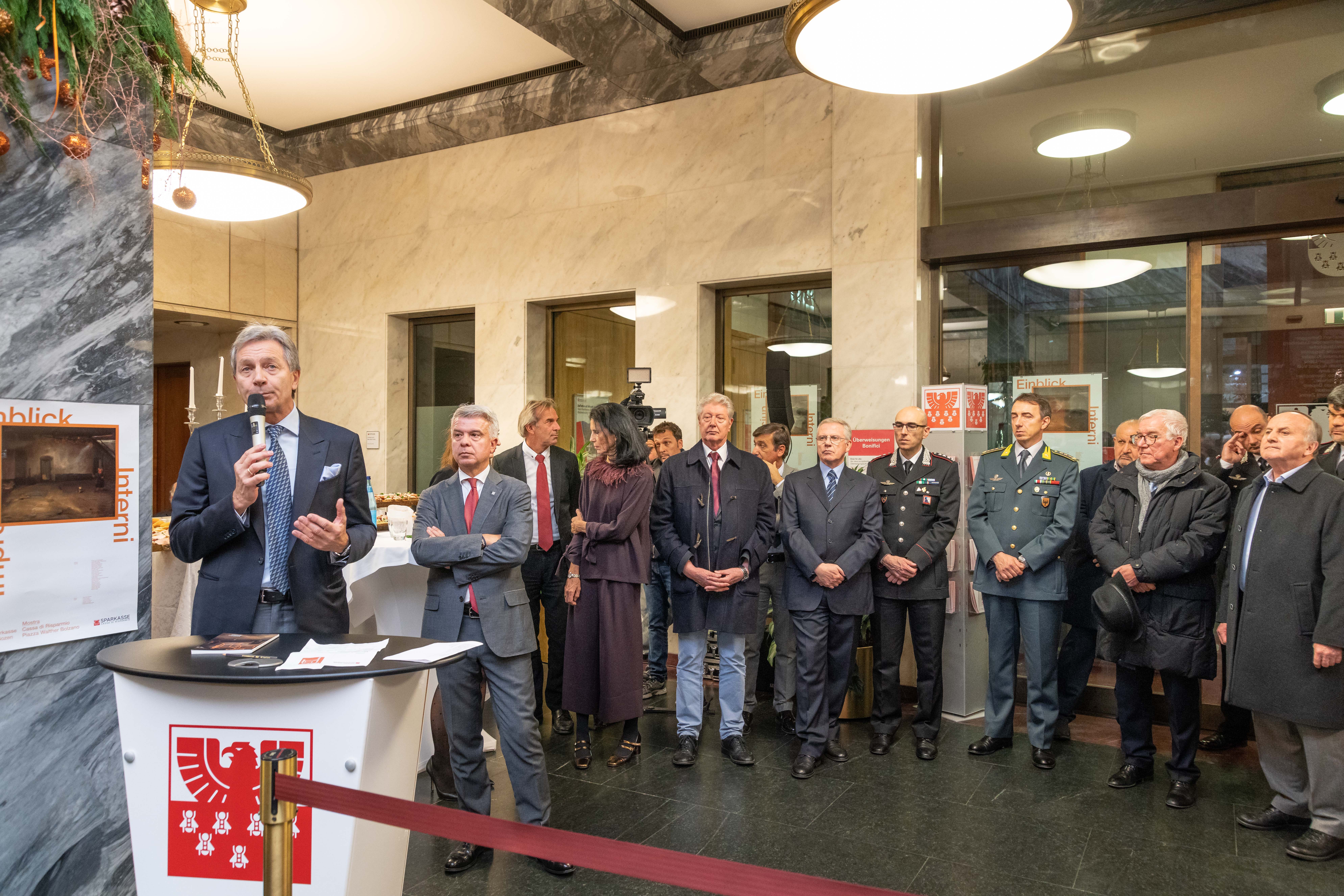 An der gestrigen Vernissage nahmen, neben dem Vize-Präsidenten der Bank, Carlo Costa, und der Präsidentin des Aufsichtsrates der Sparkasse, Martha von Call, u.a. auch der Regierungskommissär Vito Cusumano, die Präsidentin des Verwaltungsgerichtshofs Edith Engl, der Vize-Direktor der Banca d’Italia in Bozen, Luca Moscandelli, der Vize-Quästor Luigi Nappi, der Kommandant der Carabinieri-Legion von Bozen, Cristiano Carenza, die Kommandantin der Straßenpolizei von Bozen, Anna Lisa Mongiorgi, Oberst Gabriele Procucci vom Kommando der Finanzwache, der Vize-Bürgermeister Christoph Baur, der Präsident des Südtiroler Wirtschaftsrings, Hannes Mussak, sowie, in Vertretung des Südtiroler Kulturinstitutes, der Präsident Hans-Christoph von Hohenbühel, und in Vertretung des Südtiroler Künstlerbundes, der Präsident Arch. Alexander Zoeggeler, teil.
