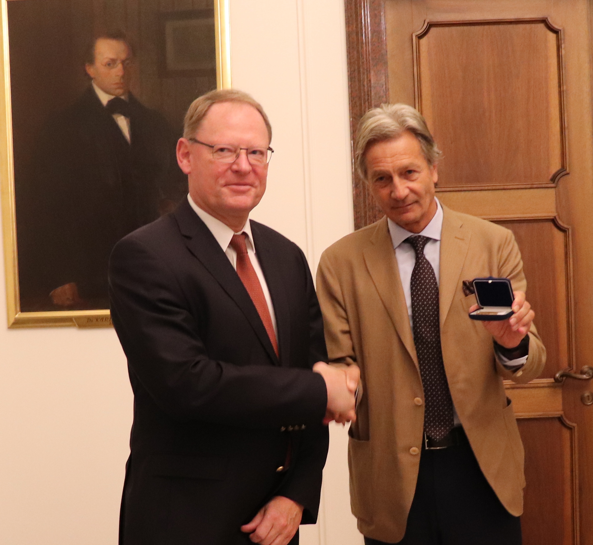 Im Anschluss übergab Gerhard Brandstätter als Zeichen der Anerkennung und Wertschätzung Helmut Becker, der mit Weitsicht bereits im Jahr 2015 die Bedeutung einer engen Zusammenarbeit mit der Südtiroler Sparkasse erkannt hat, die große Goldmedaille der Sparkasse.