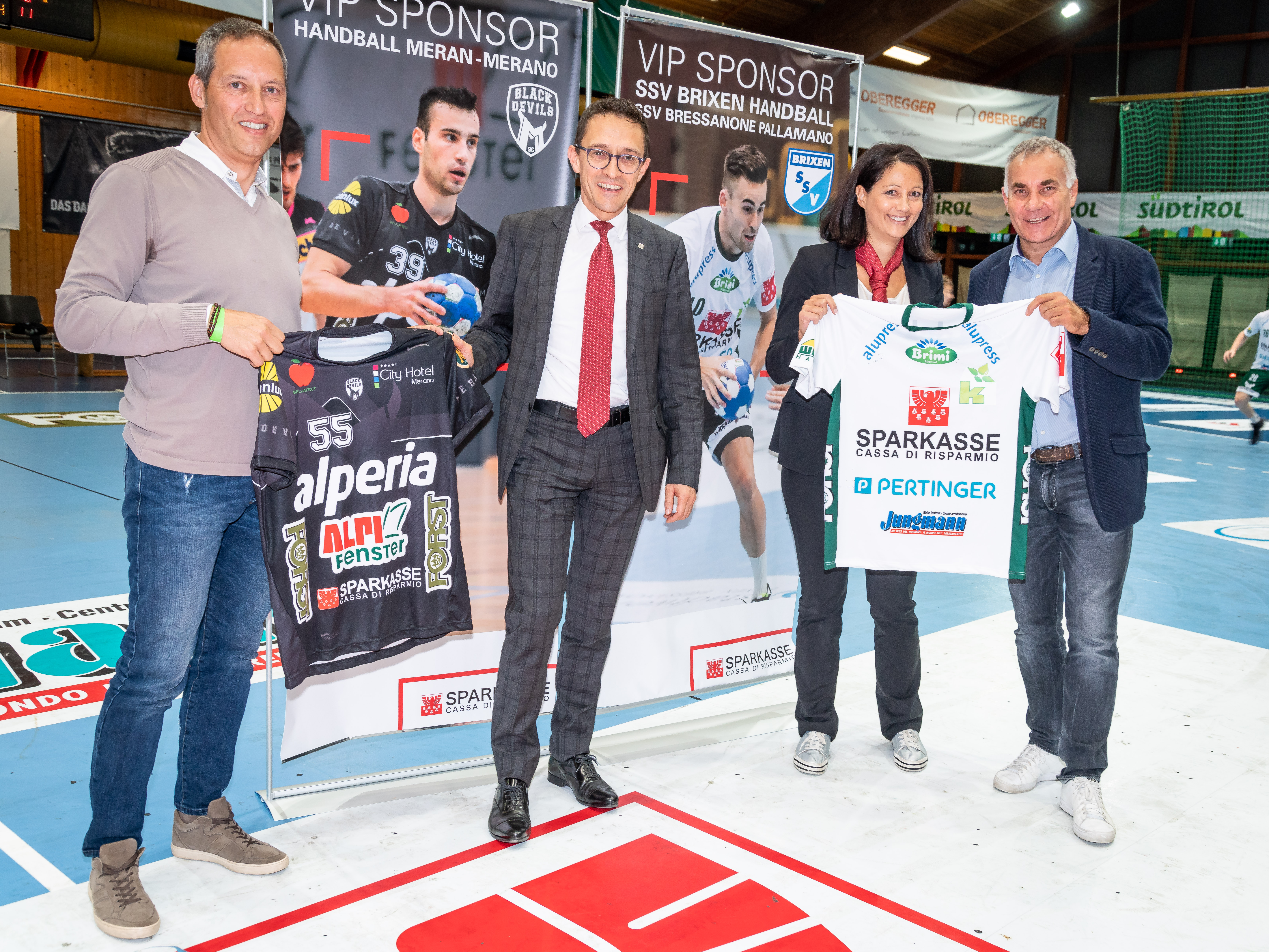 In Brixen stieg somit ein Südtiroler Handballderby der Extraklasse. In einem spannenden Spiel siegte die Meraner Mannschaft mit 25:22 gegen die Brixner. Die beiden Sponsoring-Partnerschaften wurden im Rahmen des Derbys in der Sporthalle vorgestellt. Zu diesem Anlass wurde auch das neue offizielle Mannschaftstrikot beider Vereine an die Bezirksleiter der Sparkasse, Marion Prast (Eisacktal) und Joachim Mair (Burggrafenamt), überreicht. Weiters erfolgte die Prämierung der besten Spieler sowie die Verlosung von Preisen an die zahlreichen, auch aus Meran angereisten Fans.