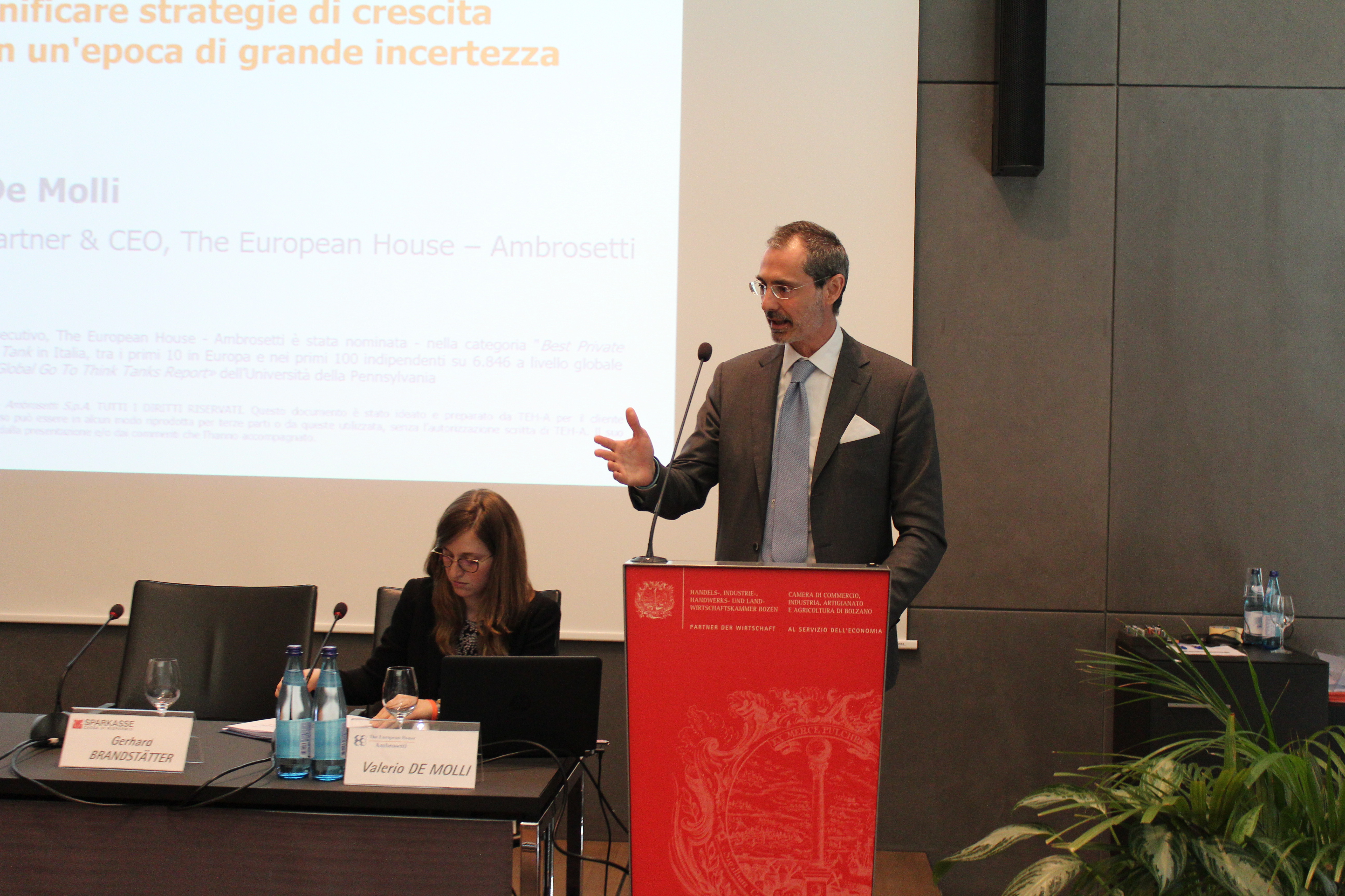 Im Rahmen der Tagung sprach Valerio De Molli, Managing Partner & CEO von The European House – Ambrosetti über makroökonomische Szenarien und die wichtigsten Megatrends, die die globale Wirtschaft beeinflussen. „Die Wirtschaft muss sich fortlaufend an die wichtigsten Megatrends anpassen, den demografischen und technologischen Wandel berücksichtigen sowie die digitale Transformation meistern. Technologie, Innovation und Wissenschaft bieten Chancen wie nie zuvor“, informierte De Molli. Außerdem ging er auf die Besonderheiten der Südtiroler Wirtschaft ein und auf den prioritären Handlungsbedarf für heimische Betriebe in wirtschaftlich unsicheren Zeiten. Abschließend erläuterte er die Methoden für krisenfeste Wettbewerbsstrategien.
